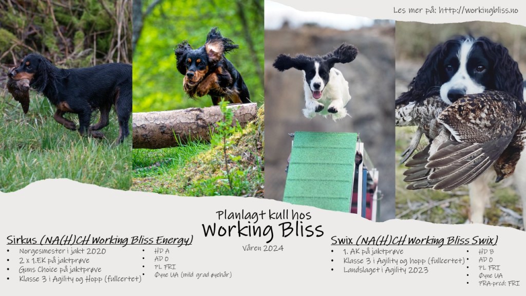 Valper født 8. mars 2024 etter vår Sirkus (NA(H)CH Working Bliss Energy) og Swix (NA(H)CH Working Bliss Swix). Valper vil bli solgt til aktive hjem som vil bruke hunden til jaktprøver, jakt og hundesport.