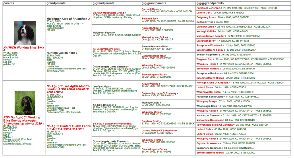 Linjene til Swix og Sirkus inneholder mange velmeritterte jakthunder, og de selv og deres foreldre har bevist at jaktegenskapene er med videre til kommende generasjoner. Stamtavlen til valpene i denne kombinasjonen vil se slik ut: